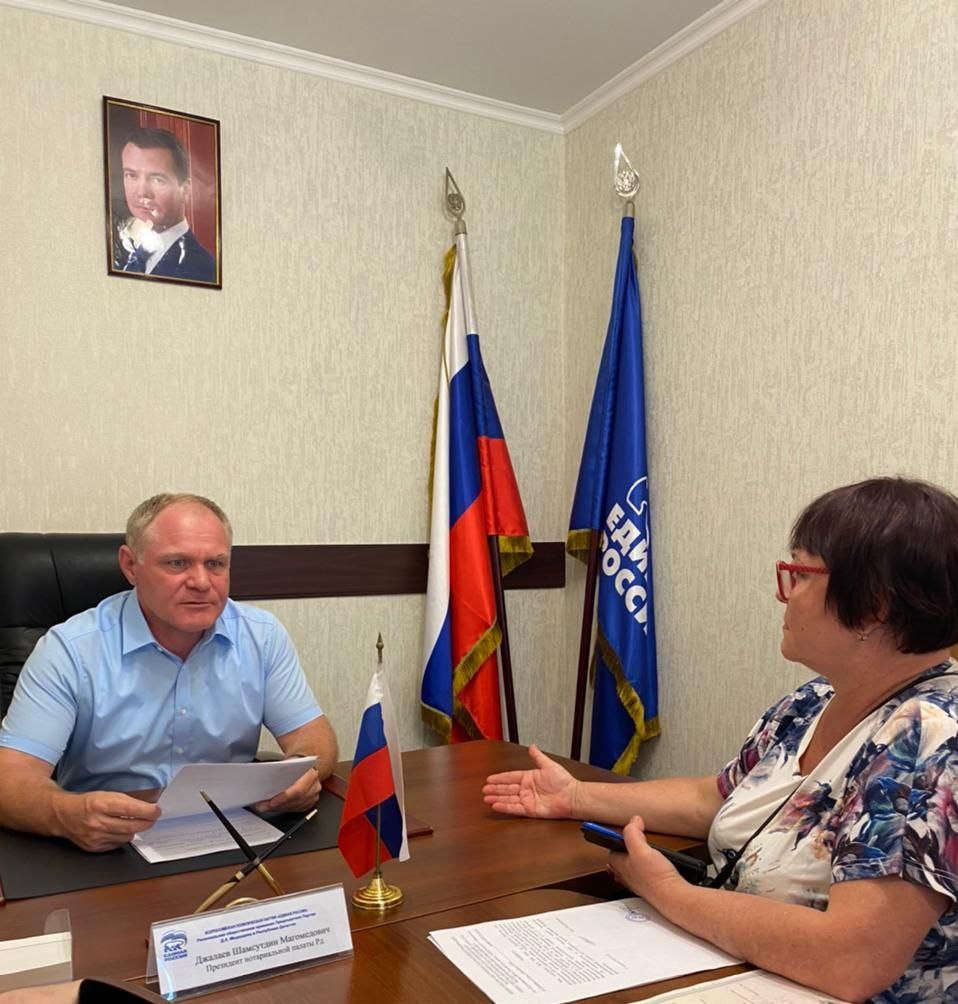 В рамках «Недели приемов по вопросам правовой поддержки граждан» проводимой по инициативе Всероссийской политической партии «Единая Россия» Президент Нотариальной палаты Республики Дагестан Шамсутдин Джалаев провел тематический прием граждан в Региональной общественной приемной Председателя партии «Единая Россия» Д.А. Медведева.